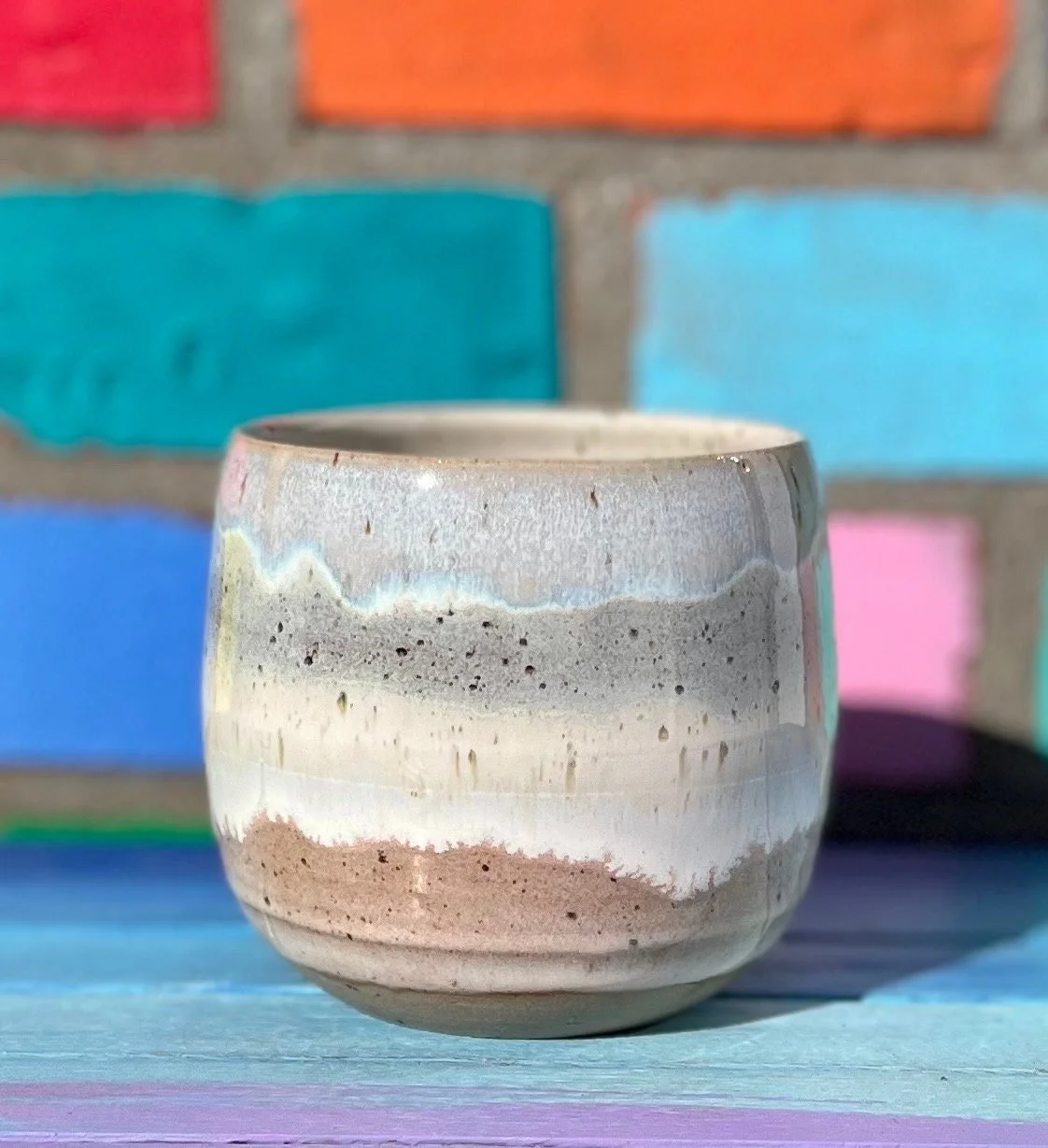 Blau/grauer/ weißer Becher aus Keramik mit Spots mit schönem Glasurverlauf. Die Becher sind bei 1225 Grad gebrannt, können in die Spülmaschine und die Glasur ist natürlich auch lebensmittelecht.